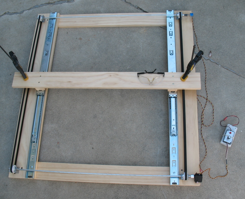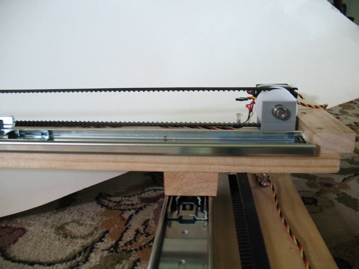 To the top of the two drawer glides, mount a small filler block (we used some scrap 1" thick wood, which allowed the Y stage to clear the X stage belt), then the Y stage board - we used the 1x4 for that since a thinner board gives you a bit more work space. When mounting the filler blocks, it was handy that the top slide had a plastic release catch so we could pull the glide off, attach the block, then slide ti back in again.Mount two more timing belt pulleys and a timing belt on this stage, leaving room for the drawer glides on one side.