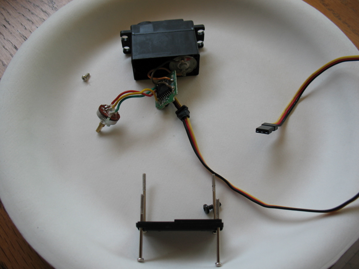 We won't go into too much detail on hacking a servo for continuous rotation - there are plenty of site on the web, and Instructables too. Some servos are easier, and if it looks tricky, ServoCity sells modified servos with the potentiometer outside already. For the HS-6965HBs, we pulled the gears, then popped the motor down by wedging a tiny screwdriver between the motor gear and the housing it is in to force it down. We then removed the pot and pulled the wires out through a small hole we drilled in the case. We have no idea if this is the proper way to do it. The HS-425BBs we originally used were even easier since the circuit board comes right out.In both cases, we also cut off the limiting tab on the main gear. We used a Dremel tool for this - but we had to clean it well after that.