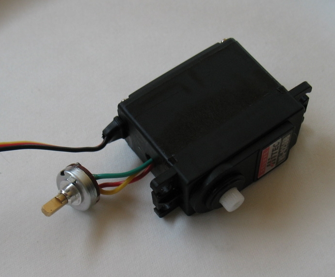 With the potentiometer outside, we extended the wired by a ~3 feet for the new potentiometers using some spare servo wire we had around, but pretty much any wire will do - you will need 3 conductors. On our servos, the yellow wire was the sweeper, and we used trial and error to find the correct wiring of the other two.