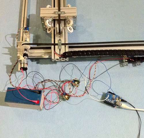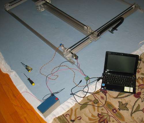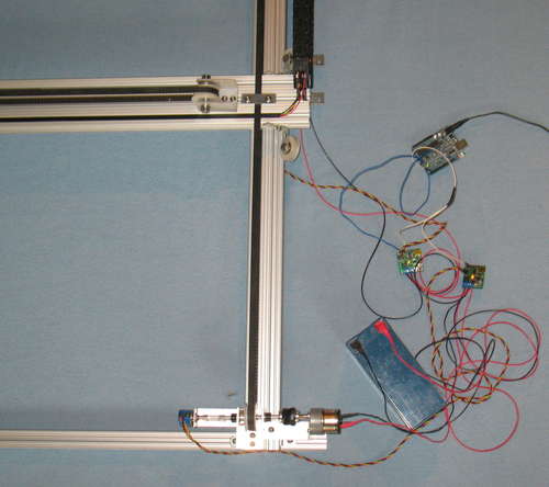 For this project, we decided to use an Arduino to run the JRK controllers. So, we need to time the position commands to make the X and Y axes move together evenly. We could also have used the Arduino to drive a Lynxmotion SSC-32, but since the JRKs also take serial commands directly, it seems cleaner to have one less set of boards.