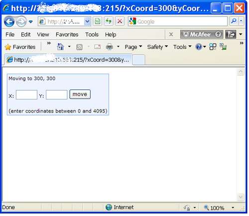 There are many options to set this up for Internet control. For the previous project, we used a Siteplayer Telnet Ethernet to serial module plugged directly in to a Lynxmotion SSC-32 servo controller, and the servo or JRK controller plugs into the SSC using the R/C command mode. This is a good setup for web server control since it needs only telnet commands (easy in PHP) to control it as long as the web server buffers and sends the commands nicely. The Lynxmotion SSC-32 also allows the commands to be run over a set time period (a couple seconds typically), so oblique moves work well with the timing - the shorter distance axis moving more slowly.
